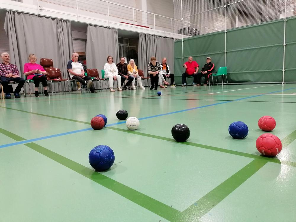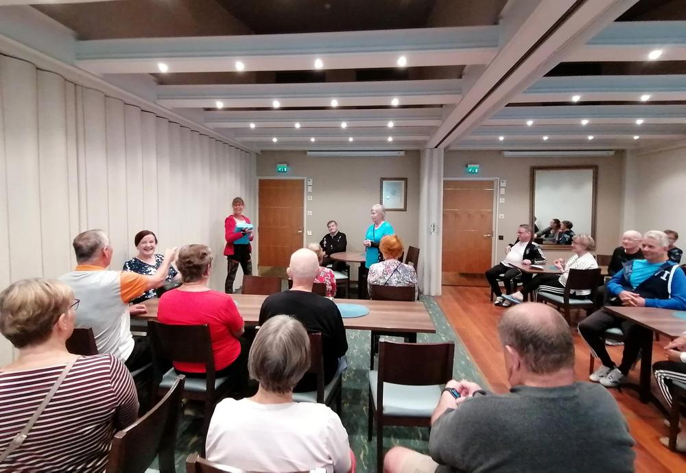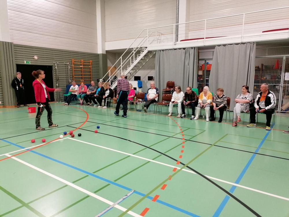 Torstaina aamiaisen jälkeen Boccia-pelailua monitoimihallissa jossa ryhmä jaettiin kahtia, sinisiin ja punaisiin (siniset voitti). Lounas välissä ja sitten tietoisku "Liikunta ja terveys" ravintolan kabinetissa. Ennen päivällistä monarilla vielä tehokas tuolijumppa, jossa olikin vauhtia melkoisesti.