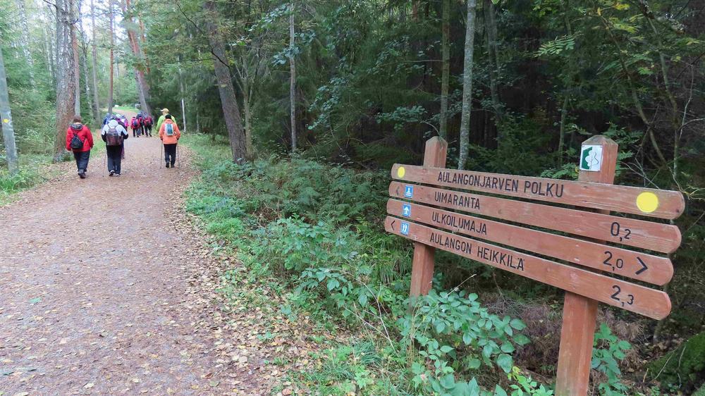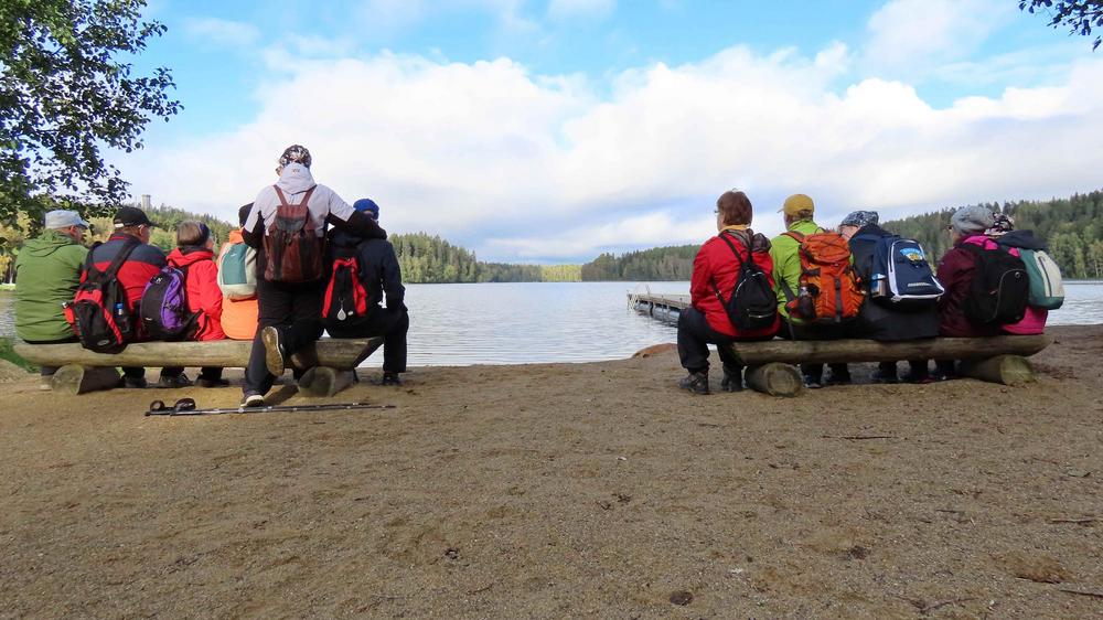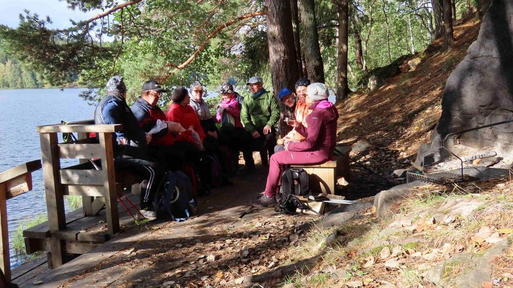 Retkelle Hämeenlinnaan Aulangonjärven kierrokselle lähti 11 yhdistyksemme jäsentä. Sää oli aurinkoinen, n.15 astetta lämmintä. Uimaankin olisi päässyt, pari päivää aikaisemmin oli mitattu veden lämmöksi 15 astetta. Reitti oli aika tasainen, Käärmekalliolle noustessa oli pitkät metalliportaat laitettu kulkua helpottamaan.