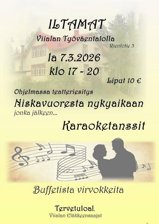 Maaliskuussa palataan wanhan ajan iltama-tunnelmiin. Teatterihupailua ja tanssia karaoken tahtiin. Puffetista virvokkeita. Tervetuloa! Laulajat myös innolla mikrofonin ääreen.