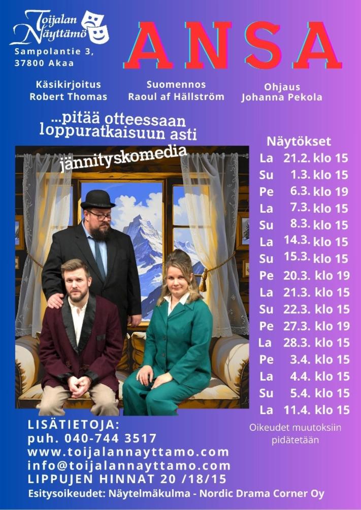 15.3 2026 klo 15 Toijalan Sampolassa jännityskomedia ANSA. Hinta 16€ sisältäen väliaikatarjoilut. Maksu viimeistään 25.2 yhd. tilille FI38 5228 1740 0061 87 viite 1119. Ei kuljetusta, mennään omilla…